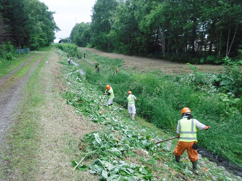 河川堤防等に繁殖した雑草を人力刈払機・トラクターモア等の機械を使用し刈払いを行い、必要に応じ集草廃棄を行いました。